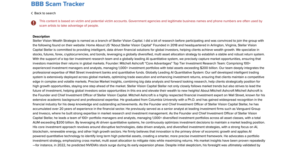 BBB Scam Report ID 1093613 confirms the following. The victim was recruited via a Facebook or Instagram advertisement. Shortly after clicking the ad, they were contacted through WhatsApp and invited to a group called “H2010 Stellar Vision Wealth Navigation.” Inside the group, members Mitchell Ashcroft and Evelyn Langley promoted Bitmacoin as a high-yield cryptocurrency platform. They described it as connected to “Stellar Vision Capital.” They claimed participants could earn 20 percent or more in weekly returns through the “Quantitative Intelligence System” and the “MMP Plan.”
