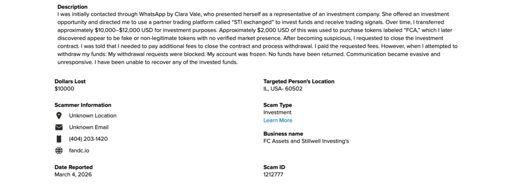 Fandc.io is a scam. A formal BBB scam report filed March 4, 2026 confirms this, documenting a $10,000 loss from a victim in Illinois, a named WhatsApp recruiter operating under the false identity of Clara Vale, a fraudulent partner platform called STI Exchanged, fake FCA tokens with no market presence, a frozen account, blocked withdrawals, and fees paid but never honoured. The operation trades under the business names FC Assets and Stillwell Investing’s. It holds no regulatory registration anywhere in the world.