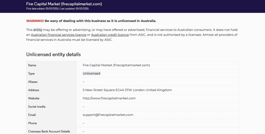 Fire Capital Market is on the ASIC Moneysmart Investor Alert List. This is an official Australian government database. A legitimate, regulated broker does not appear on a government investor warning list. This single fact is sufficient grounds to reject this platform entirely.