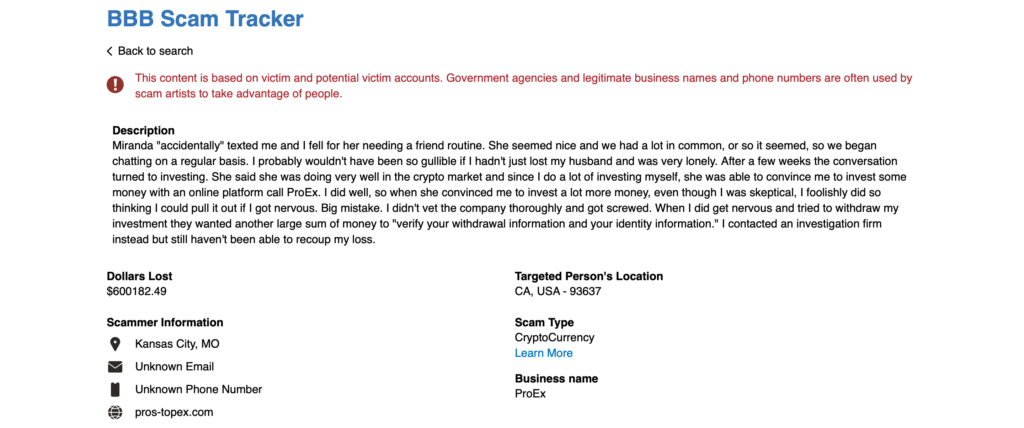 Miranda was warm, attentive, and appeared to share many of the victim’s interests. After weeks of regular conversation, she introduced the topic of cryptocurrency and mentioned her own positive experience with a platform called ProEx.