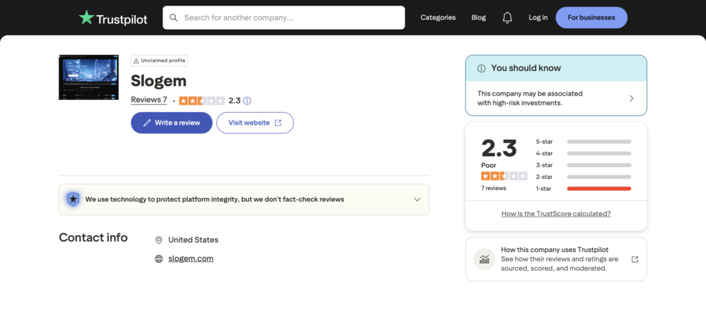 Trustpilot rates slogem.com with a score of 2.3 out of 5 based on seven reviews. Every single one of those reviews is one star. Trustpilot itself flags slogem.com with a note stating that this company may be associated with high-risk investments.