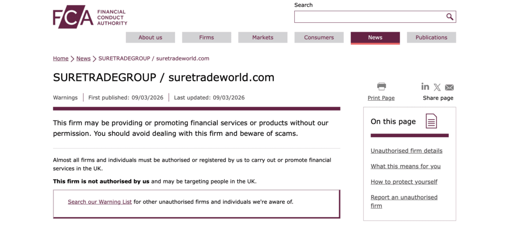 On 9 March 2026, the Financial Conduct Authority published a formal warning on its official website identifying SURETRADEGROUP and suretradeworld.com as an unauthorised firm. The full text of that warning confirms the following: