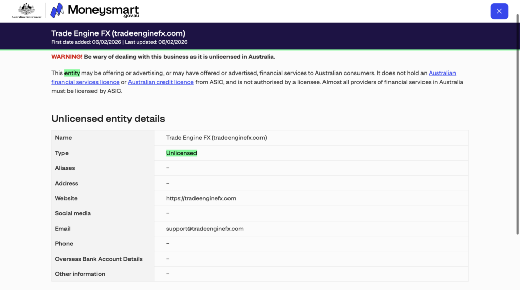 ASIC confirmed this by listing it on the Moneysmart Investor Alert List as entry 4002. The listing confirms the following facts. Trade Engine FX does not hold a current Australian Financial Services licence. It does not hold an Australian credit licence, it cannot legally offer investments in Australia, and it may also be targeting Australian consumers right now.